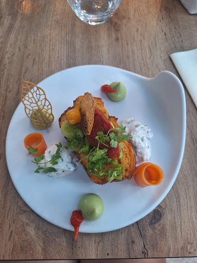 L'entrĂ©e, une composition audacieuse, m'a Ă©tĂ© prĂ©sentĂ©e dans un Ă©crin de noirceur qui faisait resplendir les nuances vertes et rouges des lĂ©gumes croquants, accompagnĂ©s d'une piĂšce de viande dĂ©licatement posĂ©e, telle une Ćuvre d'art contemporaine. La finesse du goĂ»t rĂ©vĂ©lĂ©e par chaque bouchĂ©e Ă©tait une invitation Ă un voyage sensoriel, oĂč la fraĂźcheur des produits du terroir s'entremĂȘle avec l'audace d'une cuisine rĂ©solument moderne.