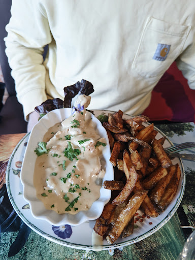 We walked in expecting a touristy place with average food, but we were pleasantly surprised. They have 1 waitress and 1 cook but the food is wonderful, freshly prepared, they are so friendly and were accommodating with vegetarian and gluten free. Service is quick. We shared 1 salad (the most enormous we've ever had), 1 burger, the lunch special for only 20euro with terrine and chicken in brie sauce, between 4 people and we are so full. The chips/French friends were actually crunchy and fluffy, best chips we have had so far in France. All the produce is from within 20-30km of here and vegetables from the cook's father's farm. The chocolate hazelnut ice cream is...