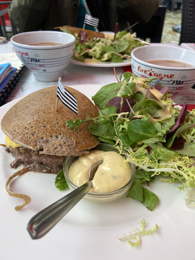 Read moreEn tant qu'intolérant au lactose, j'avais peur de tenter l'expérience de la crêperie en Bretagne, mais notre choix s'est arrêté sur la Crêperie Ty-Ru, parce que même si elle ne paye pas de mine en apparence, cette crêperie au milieu des autres crêperies de la place réputée pour être celle des crêperies de Quimper m'a inspiré confiance, moins bling-bling que les autres, plus "conviviale"... Le "burger breton" à base de crêpes était délicieux, et ne m'a absolument pas rendu malade comme j'en avais peur étant donné mon intolérance alimentaire (je prenais le risque sciemment car impossible de résister à l'envie de manger de la crêpe bretonne).
