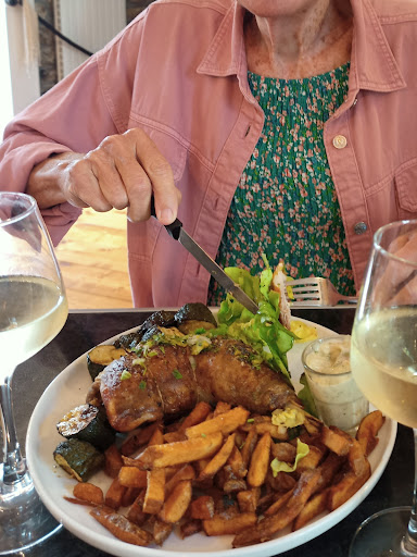 After nearly 2 weeks in Northern France we were desperate to find a restaurant that could offer something other than the ubiquitous mussels, galettes, pizzas and burgers. This Bio restaurant was the perfect answer! The restaurant is on the first floor above an organic bakery and shop that is owned by the same people. It offers diners partial views of the cathedral spires from the roof terasse but we preferred to sit inside. We both chose an entree of organic roast chicken leg stuffed with aubergines and served with chips, courgettes and lettuce and a creamy sauce. It was beautifully cooked, tasty and very satisfying. The quality of the food was evident in the superb flavour. Well done...