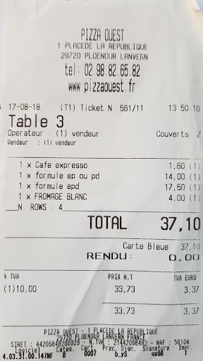Read moreTout s'est bien passé (acceuil, repas frais Et bon-voir très bon, propreté local et wc) jusqu'au dessert puis l'addition. Pour 2 menus à 10,50 euros avec gâteau chocolat-poire en dessert+ café +1 verre de vin: 1- j'ai trouvé étonnant à 13h30 que le gâteau n'étant pas cuit, on me propose un fromage blanc/fraises. Cependant:très bon 2-total de l'addition: 37,5 euros en comptant mon fromage blanc alors qu'il était supposé remplacer mon dessert du menu. 3- un ticket de l'addition trafficoté: formules à 14 et 17, 50 euros? au lieu de 2X 10, 50 euros!!! 4-CONCLUSIONS: Ou la gérante nous a pris pour des pigeons, mon petit garçon de 11 ans et moi-même ou pour des touristes bien naïfs!!! Comme j'estime que je devais payer entre 25 et 27 euros, elle m'a donc volé de 10 à 12 euros (équivalent d'un menu!) Vous êtes donc une voleuse, Madame la gérante, sous votre air faussement sympathique. Vous pouvez toujours me rembourser par virement bancaire (à voir si vous êtes si honnête que ça!!) VOIR LA NOTE EN...