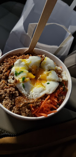 J'ai découvert ce restaurant et ce plat très récemment et j'ai vraiment adorer. Le plat est bien chaud. Composer d'une base de riz ou de nouilles. Personnellement je recommande le riz. Le plat est accompagné de crudités (carottes concombre, mais et petits pois). Une viande au choix ici, du boeuf. Vous pouvez avoir du poulet au curry, tofu, poisson.. Le bibimbap du chef est celui de la photo. Il y a un œuf au plat. Vous avez également une sauce aux choix parmis 6. Personnellement je prends celle au curry avec ail ou sésame je ne sais plus Servis avec des baguettes et une cuillère en bois. Vous avez également la possibilité de prendre une boisson, une entrée et/ou un dessert. Bibimbap du chef avec boissons revient à 10,5€ et 12,5€ avec dessert. En résumé, je recommande, j'y vais "souvent" et je ne m'en lasse pas. Cela change de la junkfood classique. N'hésitez pas.