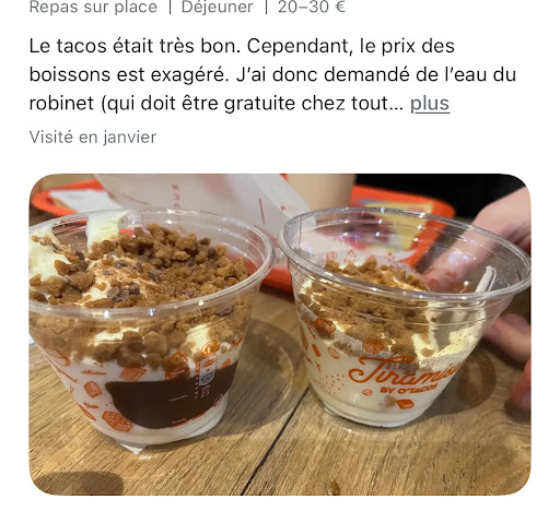 Mon jugement se basera uniquement sur la qualité et quantité des produits. Première fois que je viens dans ce nouveau O ‘Tacos de Rambouillet (78). Personnel vraiment aimable et sympathique, rien à redire. Maintenant en ce qui concerne les produits commandés (3 O ‘Tacos L et 1 M). La commande à emporter arrive sous 15 minutes ce qui est plutôt correct. Je prends ma commande et regarde les produits commandés et à ma stupéfaction je m’aperçois que mes O ‘Tacos sont de forme identique même avec la version M mais surtout que la version L est vraiment très petite comparer à d’autres enseignes O ‘Tacos. Je pose la question au gérant sur ma stupéfaction ! Et lui demande si mes O ‘Tacos ne sont pas des versions medium. Le gérant me signale que je ne suis pas le seul à le lui dire mais que ce sont des dosages prédéfinis au nombre de viande commandées et que la grandeur du O ‘Tacos dépend de l’employer qui les fait plus ou moins serrés et voir avec moins de frites à l’intérieur (voir photo). Il me répond aussi que l’important c’est d’avoir deux viandes à l’intérieur ! Certes mais j’ai commandé du L et non un format M donc certainement moins de produits dans mes O ‘Tacos, et puis quand nous regardons les formats sur le site web de O ‘Tacos il Ya comme une grande différence avec ce que j’ai reçu (voir photos). Donc pour moi nous devons tous avoir le même format avec la même quantité et qualité. Après m’être expliqué avec le gérant calmement bien évidement, je passe mon chemin et reviens chez moi pour que nous goûtions les fameux "petits" O ‘Tacos. Deux personnes ont apprécié le gout des O ‘Tacos sauf leur taille (enfants de 8 et 10 ans) et deux autres non pas appréciés (16 ans et 1 adulte). Pour faire clair une sauce texane inexistante sur les deux ainsi que des oignons (supplément) inexistants ainsi que les frites d’ailleurs (voir photo). Et je conclurai par un excédent d’os à sans faire casser les dents certainement dans des merguez ou viande hachée (voir photos et la prise était au début du O ‘Tacos), je ne l’ai même pas fini de peur d’aller chez le dentiste. Vraiment passez votre chemin sur ce restaurant O ‘Tacos. J’invite même la maison mère à refaire une formation sur les normes et qualité des produits car cela nuit vraiment à l’enseigne. Je ne recommande pas ce O ‘Tacos de...