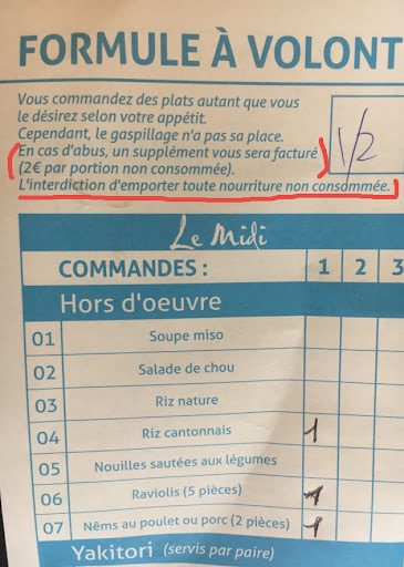 Autre points négatifs : ils amènent TOUS les plats en même temps donc on a une table qui déborde rapidement service peu chaleureux ambiance de la salle hyper bruyante les nems sont gras et aucune différence entre ceux au porc et au poulet ! tous les sushis, makis etc sont fades, sans saveurs donc pas la peine de payer pour des sashimis les brochettes sont vites froides donc immangeables vu que tout est servi à la chaîne tarif le Week end excessif pour un chinois à volonté dont la devanture laisse à désirer personnel pas souriant, ni chaleureux. L'accueil est complètement à revoir !