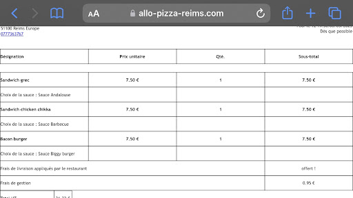 Read moreDéception !! Je commande sur le site internet et celui-ci me permet de mettre des commentaires par rapport à ma commande, ce que je fais. Les boissons livrées ne sont pas celles commandées et lorsque je demande pourquoi on me répond rupture...Je travaille également dans un restaurant qui fais de la livraison et au minimum lors de la rupture momentanée d'un produit (chose qui peut arriver) je préviens le client et je ne lui impose rien !! Surtout quand la personne au téléphone vous dit "il y a une erreur parce que vous avez commandé sur le net, vous auriez du appeler directement le restaurant." A quoi sert le site et les commentaires ??? De plus le livreur sonne chez le voisin malgré les renseignements fournis à la commande. DERNIERE FOIS...
