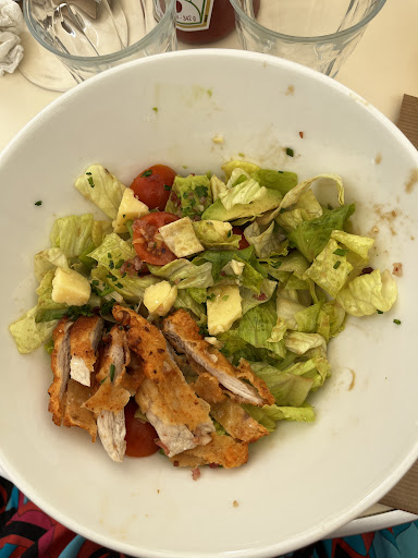 Lâaccueil est insignifiant (personnel non qualifiĂ©, pas particuliĂšrement souriant mais pas dĂ©sagrĂ©able non plus ⊠pas attentifs aux clients). Pas dâeau, pas de pain pour nous, un chien Ă la table dâĂ cĂŽtĂ© sâĂ©puisait sous la chaleur et la gamelle dâeau Ă©tait sous le comptoir⊠CotĂ© repas : Ă©gal au service : MĂ©diocre ! Le burger : tout Ă©crasĂ©, pain effritĂ©, steak trĂšs mince et frites vraiment pas bonnes. On aurait dit des surgelĂ©es mal cuites. Nous avons demandĂ© un burger/frites, le serveur ne nous a pas informĂ© que câĂ©tait en supplĂ©ment .. (pas grave si câĂ©tait encore bon !) Ma salade sunlight : ridicule au vu du prix ! La sauce ne faisait pas « faite maison » enfin je ne lâai pas aimĂ©e, une tranche de poulet toute mince et sĂšche dont la panure se dĂ©collait ⊠de minuscules « pickles » point positif : belle salade verte fraĂźche. (Le tout servi sans pain). Ma salade Ă©tait Ă tempĂ©rature ambiante, entre le vin et la salade peut ĂȘtre avez vous eu un problĂšme de frigo âŠ