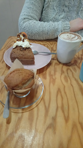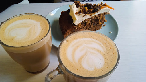 Bonjour, nous sommes venues tester ce café un samedi matin ! Nous voulions prendre un petit déjeuner, avec boisson chaude et petit gâteau . Nous sommes arrivées les premières, et avons été accueillies par une équipe sympathique. La personne au charmant accent hispanique (ou latino, pardon !) nous a installées et proposé la carte. La carte est agréable et propose différentes boissons, fraîches ou chaudes , avec l'option végétale pour remplacer le lait pour les personnes intolérantes ou véganes. J'ai apprécié le côté ludique de la carte avec les "gâteaux dodus " ou encore " muffin padutouvegan " car vous trouverez également une version vegan des muffins . Vous trouverez donc, différents gâteaux comme le cinammon Roll (à la cannelle) ou le carrot cake, fameux gâteau à la carotte avec son glaçage crémeux au dessus , pour lesquels nous avons opté, car : lors de notre arrivée la salle sentait bon la cannelle et ça donnait bien envie ... Il y a aussi des brioches et bowls sucrés ou salés ! Pour le bowl , vous pouvez opter pour un repas du midi, sain avec des légumes frais , mais à l'heure où nous sommes arrivées leurs compositions n'étaient pas inscrites au tableau . Mais celà est gage de qualité diront nous, si la composition change au fil des saisons, vous pourrez voir devant le comptoir différents légumes , et la carte fournit des détails sur la provenance des produits utilisés et cuisinés dans ce café . Nous avons choisis un latté caramel pour accompagner nos gâteaux . La boisson avait un petit goût sucré salé, peut-être avec le caramel, ou le " lait " d'avoine , j'ai apprécié , avec la belle mousse décorée digne des pubs ... Je crois qu'on ne m'avait jamais servis une boisson chaude avec la décoration de mousse comme celle là ! Le petit bémol pour moi , était le choix de l'assiette, ébréchée , sachant qu'il n'y avait pas encore d'autres clients que nous mêmes. C'est un petit détail que j'ai trouvé un peu dommage ... Sinon, il y a aussi un brunch proposé, nous ne l'avons pas choisis au vu du prix (comptez une vingtaine d'euros par personne ) En tous cas c'est une note...