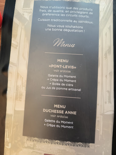Nous avons choisi la crêperie du Pont Levis que nous n'avions jamais testée, principalement grâce aux superbes commentaires sur Google. Cependant notre expérience a énormément différé de ce que nous avions lu auparavant. tout d'abord le gérant nous explique que toutes les galettes sont cuisinées au saindoux "selon la méthode traditionnelle". Très bien. En revanche, ma soeur qui est végétarienne et qui envisage de commander la galette appelée "végétarienne" sur le menu, demande s'il est possible d'avoir sa galette cuite au beurre, ce à quoi on nous répond que non, il y aura du saindoux dans tous les cas puisqu'il y en a sur tous les billigs. Alors pourquoi appeler une galette "végétarienne" dans le menu quand évidemment elle ne le sera pas ? passée la différence de température une fois entrées, où bien sûr nous avons retiré nos manteaux, on se rend compte une fois assises depuis 15 min qu'il fait vraiment froid dans la salle (pourtant petite) de restaurant. Pas très agréable en plein mois de décembre, j'ai du remettre mon manteau sur mes épaules à peine étions nous arrivées qu'un assourdissant bruit de clapet qui claquait en continu s'est fait entendre, cela venait sans doute d'une aération dans la cuisine mais c'était vraiment insupportable, on s'entendait à peine parler ! une fois les galettes terminées, on commande 2 crêpes histoire de finir sur une note sucrée et, avant de nous enlever les assiettes, le serveur nous demande de garder nos couverts...parce qu'on "garde les mêmes" pour le dessert ! Je n'ai jamais vu ça dans un restaurant. Je venais de manger de l'oeuf dans ma galette, je devais donc enchainer sur ma crêpe au sucre avec l'oeuf séché sur mon couteau ! les serviettes en papier étaient plus fines qu'un simple kleenex, franchement je ne savais même pas qu'il en existait de si transparentes, encore un détail pas très agréable dans un restaurant question de détail encore, mais les sets de table, tous en plastique, dépareillés et complètement décolorés, laissent là aussi une impression de "petite économie" sur le dressage de table le service, assuré par deux jeunes garçons (les enfants du patron j'imagine), n'a pas été des plus agréables non plus, ma soeur a demandé une carafe d'eau à 2 reprises (puisqu'elle avait été oubliée) et un des 2 serveurs s'est finalement exécuté presque en levant les yeux au ciel, l'air visiblement "saoûlé" de nos demandes (bien sûr carafe apportée sans verres puisque, comme pour les couverts, nous devions boire l'eau dans les bolées de cidre du repas) le meilleur pour la fin, lorsque j'ai demandé du sel pour rajouter sur ma galette, on me répond qu'il n'y en a pas, ils ont "oublié" d'en racheter, mais que la galette est déjà salée ! J'aime asaisonner mes plats comme je l'entends pour commencer. Et ensuite être dans un restaurant qui ne peut pas fournir une salière ?? Nous sommes littéralement tombées des nues. Enfin ça me parait être indispensable et la base dans un resto, d'avoir sel et poivre à disposition pour les clients ?? Quand bien même ils se rendent compte que la dernière salière est vide, peut-être en acheter rapidement à l'épicerie du coin avant le service ?? au moment de payer, lorsque le patron nous demande si tout s'est bien passé, je tiens à lui expliquer les raisons de notre petit mécontentement, ce à quoi il a jugé intelligent de nous répondre que les non changements de couverts et les serviettes si dérisoires étaient...pour un souci d'écologie ?? pour finir, les galettes étaient bonnes, les crêpes aussi, c'est vrai Mais clairement une crêperie où nous ne retournerons pas au vu de tous les détails qui ont malheureusement rendu notre expérience désagréable. Je passe rarement mon temps à écrire de si longs avis, mais étant donné que nous avions choisi cet endroit spécifiquement pour toutes ses bonnes critiques, notre déception a été grande et je trouve important de dire aussi ce qui ne va pas quand...