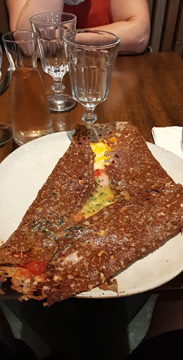 Nous y avons mangé un midi en famille. Les galettes étaient très bonnes ainsi que les crêpes. J'ai été déçue de la galette saumon St jacques ou seul 3 tranches de St Jacques hornais la galette... En revanche très généreux en saumon. Nous avons également trouvé que les tables sont très très proches, la serveuse a du mal à se faufiler entre les tables. De plus elle a déposé brutalement une des assiettes sur notre table et à ecrabouillé le doigt de mon fils... Une TV est allumée sur bfm, il n'y a pas de son mais quand même quel intérêt dans un restaurant ?! Les galettes sont très bonnes c'est vraiment dommage que les a côtés...