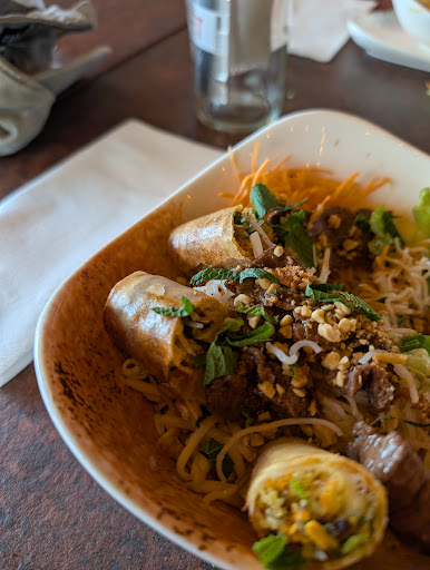 Nous commandons en plat principal le curry vert et un bo bun. Le curry vert était définitivement le meilleur des deux, mais le curry avait une texture et un goût dilué, et il était servi sans cuillère (ce qui est d'ordinaire utile pour tremper le riz dans le curry et standard dans tous les restos thaï que nous avons visité jusque là). Le Bo bun est arrivé servi accompagné d'une sauce super acide (beaucoup trop de vinaigre, pas un grain de sucre). Je n'ai donc pas pu utiliser la sauce comme de coutume (que vous verseriez sur le plat), ce qui a rendu les nouilles plutôt insipides. Les "nems" déposés en morceaux sur la salade autour des nouilles de riz avaient l'odeur et le goût des anchois. Je ne pense pas que c'était des anchois, mais c'est ce qui s'en rapprochait le plus, et de toute façon une saveur qui n'a rien a faire dans des nems. Très décevant pour un nouveau resto dans un quartier oui il y...
