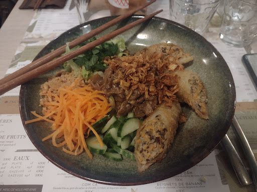 Read moreLa cuisine est vraiment délicieuse. Les produits sont frais, de très bonne qualité. Par contre, les tarifs sont chers et le service laisse un peu à désirer. Nous posons la question de savoir s’il existe un menu pour le midi, ce qui est le cas dans la plupart des restaurants, et cela semble avoir choqué le serveur (un peu agacé car apparemment nous ne sommes pas les seules à avoir posé la question). La personne qui déjeunait avec moi est allergique à la noix de coco. Nous l’avons signalé pour le café gourmand et demandé si la boule coco pouvait éventuellement être remplacée par autre chose. Nous n’avons pas été bien reçues sur ce point. Le serveur nous a apporté le café gourmand avec la boule coco, en suggérant que nous nous arrangions entre nous. Sauf que j’avais indiqué que pour des raisons de santé, je ne pouvais pas prendre de dessert. Quand j’ai redit que je ne pouvais pas la manger non plus, il est parti sans un mot et est revenu quelques minutes plus tard pour « poser » (jeter serait presque plus exact) quelques nougat dans une coupelle sur la table, à nouveau, sans un mot. Pour le paiement, un peu compliqué aussi. Nous voulions payer une partie avec une carte restaurant, il nous a été demandé de régler le solde en espèces. Bref, de la très bonne cuisine vietnamienne, mais un peu cher, avec un service pas tout à fait à la hauteur du...