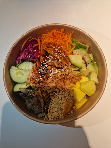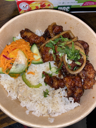 Quand au bol de riz poulet caramélisé ne vous attendez pas à avoir autre chose, une grosse plâtrée de riz blanc sans assaisonnement et le poulet, bien que caramélisé correctement, n'a pas une goutte de sauce en plus qui pourrait rendre le riz plus agréable a manger.