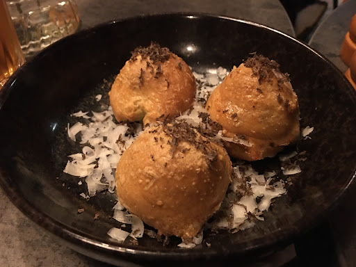 Exellent workers and nice atmosphĂšre in here, with a classic 40's music that was not too loud. We came for the breakfast and was everything is extremly delicious. My Chai latte with vegetal latte was creamy and so also the the cappuccino of my bf, I categorize good cafĂš shop from that because I'm a cappuccino lover. We order the eggs with mushroom and bacon, served with toasted bread and some butter and as sweet the pancake with fruits, and both was so great. I loved the pancake the syrup and cream on the top...