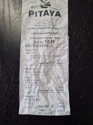 Read moreNous sommes venu hier soir 17/12 Il y avais du monde. Nous avons demander le temp d attente vu que notre famille prenait à emporter dans les alentours. La dame a la caisse nous a dit qu ici 10 min. Nous avons donc commander à pitaya .. Première déception lorsque nous avons êtes servit 42 min après la commande ... Cela est bien trop long. Mon copain a pris un boeuf thai, il a été très déçue les pâtes au riz manquait sérieusement de cuisson, il n avais pas beaucoup de bœuf, un supplément crevette que nous cherchons toujours. J ai pris un plat végétarien (que je prend souvent qui n avais pas dutout le même gout) supplément crevettes, tofou ( 2 crevettes....) Les quantités et qualités sont différentes qu auparavant.