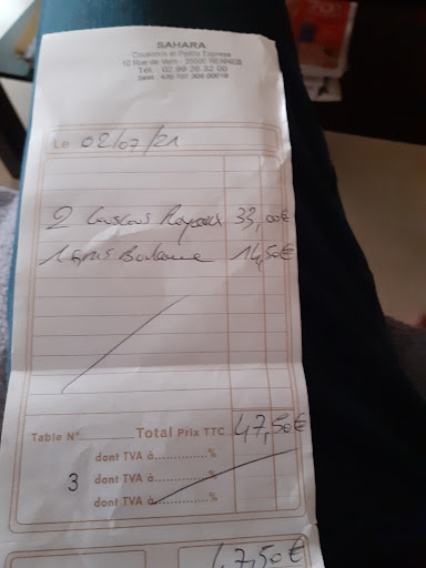 Pour le 1er janvier 2021 , j’ai commandé un coucous j’ai téléphoné , le livreur est venu de bonne heure , vu le confinement ... le couscous était excellent ça fait plaisir d'avoir un petit air oriental à table , MERCI BEAUCOUP À VOUS TOUS , ET BON COURAGE POUR LES JOURS AVENIRS . MERCI BEAUCOUP ET PRENEZ- SOINS DE VOUS . En espérant que pour cette année le VIRUS font comme neige au soleil et tout s’arrange . MERVEILLEURS VOEUX POUR 2021 ET LA SANTÉ POUR TOUS .les photos sont à venir ....je viens de m’apercevoir que vous avez les photos ( FÉLICITATIONS À TOUS ET MERCI ) J'ai eu l'occasion samedi de me recommander un couscous , il était excellent , comment dire , je ne l'ai pas mangé ce samedi soir 16/03 , car j'étais fatiguée , part-contrre Oui le dimanche 17/03 et lundi 18/03/2024 , il était excellent merci beaucoup pour avoir pris ma commande par téléphone . J'ai été livrée ce samedi . Mais étant handicapée je ne fais pas ce que je peux , mais sincèrement j'ai pris un grand plaisir à le déguster avec joie merci beaucoup aux personnes qui sont derrière les fourneaux et aux personnes qui gèrent . Voilà ça fait 2 fois que je me fais Livrer et j'ai une entière satisfaction en ce restaurant . Merci beaucoup à vous...