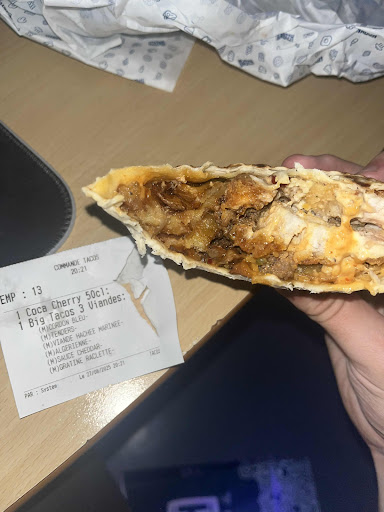 Read moreJe trouvais que vos tacos étaient les meilleurs de Rennes, mais grosse déception ce soir ! Tout d'abord je vais retirer ma commande et arrivé chez moi ce n'est pas ce que j'avais commandé, j'appelle le resto qui me propose l'échange. J'arrive donc pour retirer, une seconde fois , ma commande, OK elle est bonne cette fois ci ! La serveuse me propose un dessert et une boisson pour s'excuser (bon esprit commercial). Mais en dégustant mon tacos, déception à nouveau la répartition des ingrédients est inexistante je n'ai que de la viande jusqu'à la moitié de mon tacos !! En gros j'ai la viande d'un côté et les frites de l'autre ... Pour moi dans un bon tacos la répartition est essentielle, comme ça on mange la viande et les frites en même temps ! De plus la sauce fromagère est inexistante !! Bref vraiment très déçu ce soir, me rendre 2 fois chez vous pour ne même pas apprécier...