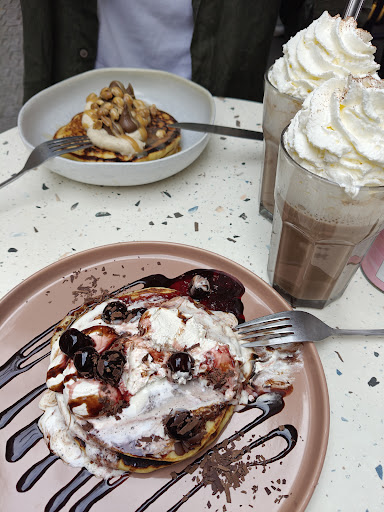Read moreDe passage à Rennes, nous nous y sommes rendus pour prendre un petit dej tardif un mardi matin (2 adultes, une poussette et une enfant de 3 ans). Nous demandons une table. La cuisinière (gérante ?), nous propose une table haute pour 4. Nous voyons une table de 6 (3 tables les unes à côté des autres) et demandons à y être installés car plus simple pour notre fille de 3 ans plutôt que des tabourets hauts et pour la poussette. La cuisinière accepte d'un air blasé en disant que si un groupe de 6 vient, nous devrons nous déplacer. Bref, nous nous installons et l'adorable serveuse vient prendre la commande à ce moment il est 10h03 (détail important). Nous commandons des pancakes sucrés et voulons des salés. La serveuse va voir en cuisine et nous voyons la cuisinière dire non pour la commande de pancakes salé. Sauf que sur le menu il y est bien inscrit commande de pancakes salé dès 10h. Il était 10h03 donc selon le menu nous pouvions. Et puis bon le restaurant fait presque que des pancakes donc bon... Clairement la cuisinière n'est pas agréable, elle nous a bien fait sentir que nous l'embêtions avec notre histoire de table. Quand on devient morose dans des métiers pareil vaut mieux changer.