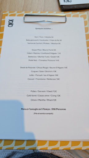 Menu composé de 4 plats (+ hors d'oeuvre) et un dessert. En termes de prix cela revient au prix à la carte... Surtout que de nombreux plats du menu à l'aveugle étaient à la carte (hors végé), un peu dommage, on s'attendait à d'autres plats hors carte.