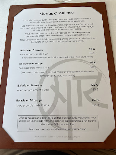 Si vous avez de la chance vous mangerez en tête à tête à côté (10cm) de la porte des toilettes en payant 125 euros par personne... ou comme nous dans le passage de l'entrée... Pour les plats, cela va: de insipide à bon, plus rarement très bon (sur 8 plats). (seul le dessert avec sa la glace au wasabi était vraiment excellent: gastronomique). Les bouillons sont bons dans l'ensemble mais jamais à la bonne température, servi à peine tiède... les makis étaient de la qualité d'un supermarché, le magret était médiocre au goût (pas tendre du tout) mais sa sauce plutôt bonne. Nous avons payé 260 euros pour deux personnes sans vin. A ce prix vous pourriez manger dans un Une ou Deux étoiles et pas à côté des toilettes???? Le chef vient vous saluer à table avec son pantalon froissé (impression négligé) très sûr de lui, cela ne m'a pas offusqué plus que cela mais je me suis dit que c'était à l'image du repas, prétentieux dans l'annonce et négligé dans la pratique... Les gens autour de nous semblaient adoré leur repas, je serais malhonnête de ne pas le préciser. Mais si vous avez l'habitude de manger gastronomique et japonnais, je ne conseillerai pas ce restaurant, à moitié prix peut-être? le mot qui nous ai venu spontanément en sortant: "arnaque culinaire au prix exorbitant". Par contre si vous voulez vraiment faire l’expérience de la gastronomie française revisitée par un chef Japonnais, je vous conseille le Sushikaï à Beaune. 90 euros par personne 5 plats et vins compris dans le cadre d'un jardin zen et d'une architecture japonaise contemporaine chic et élégante. Leur foie gras braisé façon sushi (foie gras braisé sur fine tranche de boeuf) me laisse encore rêveur 10 ans après, il se mange en une seule grosse bouchée et fond littéralement en bouche.... magique, mais c'est en...