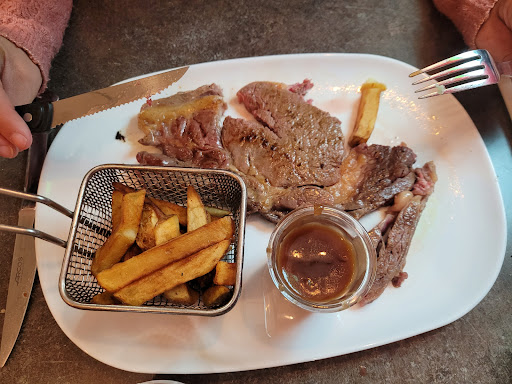 Read moreCadre et personnel sympathique mais cela ne fait pas tout !!! Arrivée à 12h30, plat chaud servi à 14h Plat A LA CARTE entrecôte frites à 29euros!!! Je vous laisse en juger par les photos. Cuisson de viande inconnue...pièce de viande très grasse et nervurée, qualité très très moyenne, sans goût, sans assaisonnement hormis une sauce "style" echalotte probablement industrielle. Cela sans aucun accompagnement, ni salade ni une tomate 😰...assiette vide, servie comme à la cantine...tres choquant quand on la voit arriver, franchement déplorable pour ce prix là pour un plat à la carte, plus que décevant. Nous n'avions jamais vu ça...on est parti très rapidement sans finir nos assiettes, une première pour...