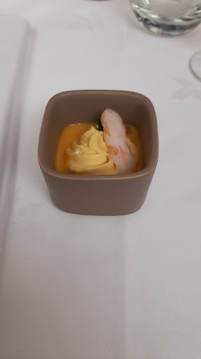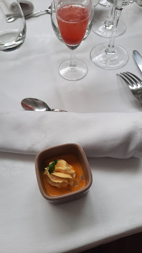 Ate Sunday lunch inside since it was so hot outside and they have air conditioning (set just right) in the restaurant. The five of us had various combinations of the 45€ menu. Great great choice. My foie gras was superb, my Charolais beef was cooked to perfection and delicious + my dessert was good. For the money, I'd say better than our meal at la Central in Roanne (which Gault et Millau gives a...