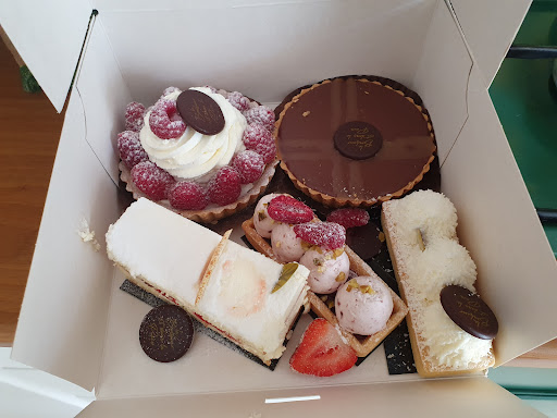 Brought back some patisserie: Raspberry Tartelette, raspberry mousse, a custard slice, something with coconut and of course a small chocolate tarte.