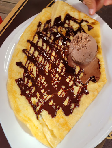 Pris 2 menus du jour moules frites très bonnes, une crêpe chocolat et une glace vanille/café, boissons de la bière et pour finir 2 cappuccino avec je précise de la VRAIE CHANTILLY délicieuse.