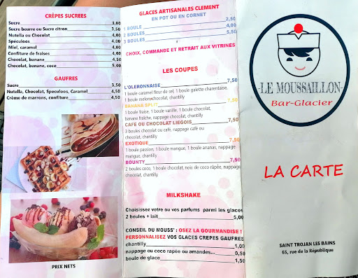 Avis mitigé.... En commentaire Google je vois cette magnifique gaufre chocolat chantilly avec la boule de glace postée par "LE MOUSSAILLON", on se dit c'est bon, nous avons trouvé notre glacier pour le séjour mais pas en réalité. La réalité est plutôt les photos postées par les clients donc avis Google. Présentation basique, rien à voir avec la photo, chantilly mal appliquée, pas de déco chocolat ni d'amandes effilées 🙁 La boule de glace Bueno à pour moi eu le coup de chaud puis reprise en glace après car à l'intérieur il y avait des cristaux d'eau donc...