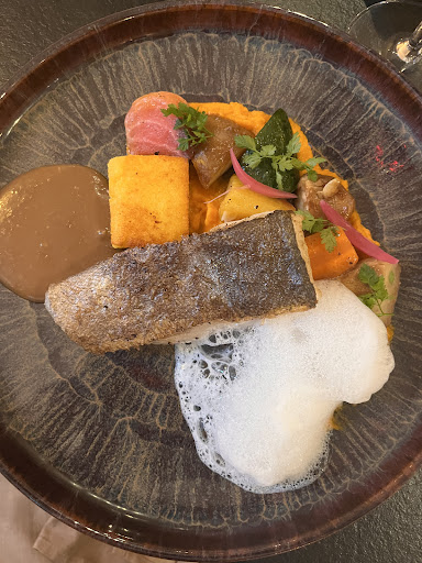 Our new favourite restaurant in the region. Exquisite in both its menu which has a unique juxtaposition of flavours and the welcoming atmosphere all in control with expert waiters. We were served with a seared tuna slice with a spiced mango purée as an mis en bouche. Then I had Foie gras poêlé à la rhubarbe & fraise, consommé de canard and my husband , Déclinaison autour du crabe Bisque, Frit & Remoulade (Tourteaux, crabe mou, crabe vert) both excellent. He then followed with a lamb wellington and me with and excellent plaice with polenta and vegetables…then the dessert..then the coffee and home made chocolates…I won’t spoil it with too much description …you get the picture, it’s very good...