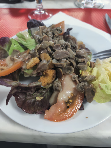 Stopped here for lunch on Saturday; town was busy due to a local event. At the entrance we thought it was so crowded at the bar, that we might not eat here but luckily there was still a table free. Daily menu, typical local dishes: charcuterie or salad as a starter, beef with pepper sauce and fries and a dessert for a very decent Euro 15. Service OK (the owner was working very hard), noisy fun atmosphere, good local food and a glass of wine. What else do you need to sit, eat and chat for much longer than...