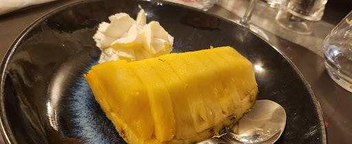 My husband and I had Saturday night dinner here. I had an absolutely delicious 😋 Roquefort cheese quiche; salmon steak in a lemon and tomato sauce, with carrots; and an OK chocolate mousse. My husband had the duck and said it was missing a certain something. He liked the burrata starter. He also had the dessert sampler.