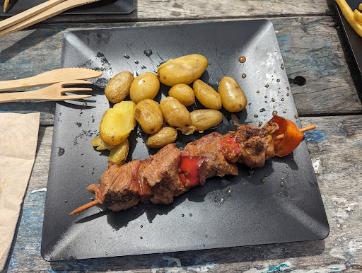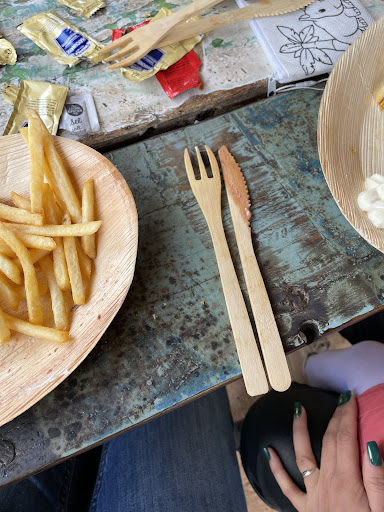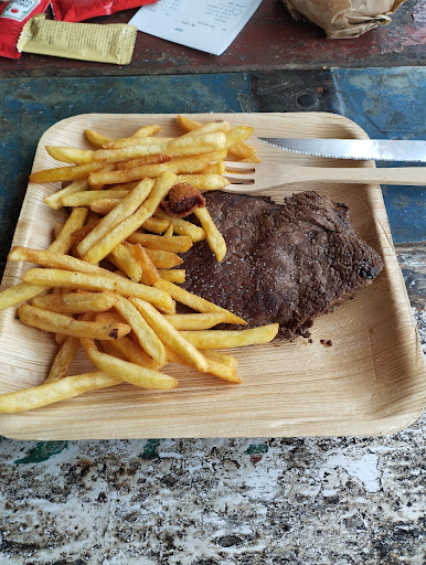Read moreDu foutage de gu..... Comment ne pas se remettre en question quand on voit les anciens commentaires, servir un steak posé sur les frites dans une misérable assiette en carton et le pompon avec des couverts en bois 😂n'importe quelle personne sensée ne servirait pas cela, faite des steaks haché, des boulettes ou autres ou changer vos assiettes et couverts, mais réagissez, vous prenez les gens pour des c... En plus hors de prix. Le mieux :la terrasse, la dame à la caisse très aimable et le coulant au chocolat même si pas maison mais peut être...