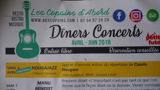 Déjà parce que le nom de l'établissement et symbolique ça s'appelle les copains d'abord c'est bien français ça rappelle les souvenirs de quelques chanteur les années après la guerre cependant hier vendredi 26 septembre il y avait un groupe 2 musiciens et une chanteuse les morceaux très proprement jouer un guitariste très professionnel le batteur également la chanteuse était magnifique malheureusement elle chantait en anglais tout le temps quelques morceaux en français aurait été les bienvenus heureusement que nous avons cet établissement où on peut dîner et écouter des groupes de musiciens parce qu'il n'y a rien d'autre à Salbris encore merci à vous les patrons et professionnel de musique...