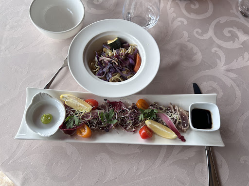 Read moreEffectivement il y'a une belle vue mais c'est la seule chose bien dans se restaurant... L'atmosphère est chargée ... Odeur de renfermé dès que l'on rentre, le restaurant est poussiéreux (tableaux, pied de chaise...), la moquette part en lambeau et la baie vitré aurait bien besoin d'un coup de raclette... Les assises et dossiers des chaises sont noir de grasse et cerise sur le gâteau il y'a encore des compositions de table déco de Noël en pleine été.... Mon premier ressenti a été de me dire : "j'espère que la cuisine n'est pas dans le même état car sinon on va choper une salmonelle à coup sur..." j'ai étais toute suite rassuré en voyant arriver une cuisine d'assemblage (plat sous vide ou surgelé passé au four ou l'on a juste à rajouté un peu de déco... Ici tomate cerise graines germé et un brin de persil qu'on rajoute pour faire style fait maison ). Tous cela pour des prix exorbitants bien évidemment.... On a voulu se faire plaisir avec un cocktail maison en apéro pour 10 euro on a eu une coupe de pétillant avec une lichette de cointreau basta c'est dommage car avec un peu de jus de citron frais et juste un peu de sucre de canne on était sur une soupe champenoise qu'on aurait effectivement pu appeler décemment cocktail... Et pour l'ambiance bah on entend le chef se plaindre en cuisine genre déborder alors qu'il y'a que 3 table.... Et quand je vois ce qu'il ose répondre sur certain commentaire négatif que certains clients on laisser sur certains site c'est honteux et cela manque vraiment de professionnalisme ! J'aimerai bien voir le chef Etchebest faire un tour dans son restaurant et le faire redescendre de quelques...