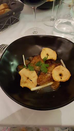 Read moreWe enjoyed a wonderful lunch in this lovely historic town. The building housing the restaurant is old and lovingly restored. We were here to celebrate a family event, and the room (upstairs) easily accommodated our group of 17 (+ a three year old and an infant, who were treated very warmly by the staff). Lunch was a prix-fixe menu with a choice of two appetizers and two entrees, and among us, we tried everything. All was superb. The wine list had many options, and with the help of the waitress, we settled on a white and red choice that were ideal for us. I started with a seafood roll (“cannelloni”) with crab and avocado, then a steak. Both were delicious, as was the desert (in my case, a fruit sorbet with hints of basil and done raspberries — delicious, but they also offered a moilleuse au chocolate pastry that was a big hit with others at the table).