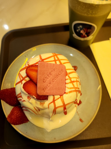 Nous sommes revenus aujourd'hui pour tester les pancakes. Nous avons pris celui à la fraise et pris un matcha latte (14.50€). Nous avons était très déçus encore ! Goût fade, sans intérêt. J'ai même pas fini ma boisson.
