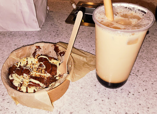 Great place! Owners are very nice and helped me a lot, even though I only know English. They taught me some words in French as well 🥰 I ordered the Kinder Bueno warm cookie with nutella and white chocolate sauce on top and pieces of Kinder. I also got a large Iced Coffee/Macchiato. Both were really good. They also have Bubble/Boba Tea, donuts and more. Open from 14:00 to 02:00, so not in the morning...
