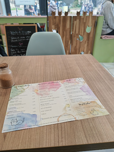 A lovely, cute, little café! Very friendly staff, who spoke a little bit of English, but enough for us to successfully communicate, immediately got us sat down with menus (only in French). It's a small place, but feels comfortable and welcoming, not touristy at all. Lets all ages in, and you only pay for the food and drinks you order, just like a normal cafe but with cats roaming around! Pretty good drink quality, amazing variety (the Dalgona and the drink of the day we're highlights), and some food available too. We counted 6 cats (some in their private resting area), one of whom was an extravert and came up to us as soon as we walked in! Overall an incredible place to visit, whether you're a local, or a...