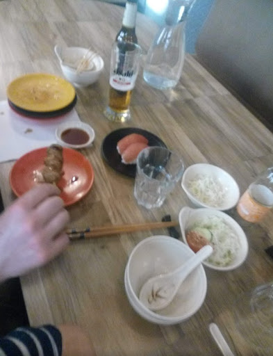 Même si nous n'avions pas réservé, ils décident quand même de nous proposer une table, ce qui est plut^pot appréciable en été. On décide tous des prendre une boisson autre que de l'eau et on attends que la valse des Sushis/Makis viennent à nous et 15 minutes plus tard, les premières brochettes, Soupe Miso, etc arrivent à côté de nous. La qualité des plats est assez égale aux nombreux restaurants asiatiques de Rouen : rien de fou, mais rien d'horrible non plus. Seule chose un peu dérangeante, les petites mouches qui se posent sur certains plats, on comprends pourquoi certaines assiettes n'ont pas était prise une seule fois du début à la fin de notre repas.