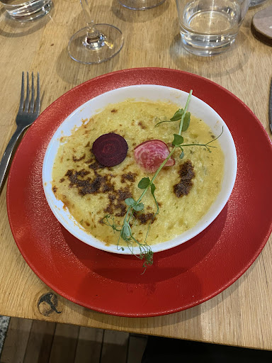 Saveurs (6,5/10) : Les saveurs sont inégales. L'entrée, une soupe de petits pois avec des rondelles de chorizo, était délicieuse et bien équilibrée. Le plat principal, un hachis de porc, manquait de saveur, bien que les petits raisins ajoutaient une touche intéressante. Le dessert, un brownie, était malheureusement trop sucré. Aussi, il convient de noter que le pain est très bon. Choses malheureusement rare.