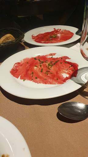Resto qui semble assez classieux par la déco, qu'on aime ou pas. J'aurai aimé voir le fond à l'avant, car celle de devant je la trouvais un peu vieillotte même si pas vilaine. Le service est à la fois bien, rapide et efficace et à la fois bof du fait que l'on ne s'intéresse pas à nous a aucun moment. J'ai dis que je voulais me faire plaisir pour mon anniv, pas de réaction du tout. On ne m'a pas demandé à la fin (ou même avant !) si ça allait... Ou pas. Quand à la cuisine. Que dire ? Les pâtes étaient trop salées au début, cela a été changé et au final même pas un seul filet d'huile sur les pâtes '' natures ''. Elles étaient pâteuses et vraiment pas agréable à manger, d'ailleurs j'ai laissé. La sauce à part manquait de goût pour l'une, l'autre semblait trop industrielle. La salade était des plus basiques, feuilles de chêne, 2 rondelles de tomates sans goût, quelques brisures d'échalote puis une sauce '' flacon 1er prix qui n'a de goût que de la moutarde 1er prix'' auquel ils ont mis un filet de vinaigre de framboise à côté. Ya mieux ! Le carpaccio. Ils disaient maximum 10 assiette. En ayant mangé ds pas mal de resto, j'ai l' habitude et connais quand même la quantité et taille des assiettes. Ici, c'était presque une assiette à dessert avec une ultra fine tranche de viande tellement fine que l'on voyait l'assiette au travers ! Au final les maxi 10 assiettes ça va vite vu qu'il n'y a rien à manger. Heureusement la dernière, était enfin correcte, plus consistante, mais n'espérez pas vous remplir l'estomac même avec 20 assiettes si c'est comme toutes celles que j'ai eu (sauf la dernière), surtt à voir les serveuses les changer, on fait du sport en les voyants ! Le tiramisu était pas mal pour la creme (mais c'est simple à faire ! Mascarpone, œufs, sucre, vanille !), même si un peu liquide. Le biscuit hélas n'était qu'un bout de génoise qu'on aurait dit les biscuits pour enfants emballés 1er prix de colo. Quasi pas de ristretto et pas du tout d'amaretto. C'est dommage de ne pas parfaire ce dessert si simple et si bon, dans un tel resto. La lumière encastrée est pas mal au plafond et ça éclaire quand on est en dessous... Mais trop ! C'est difficile d'être en tête à tête avec une telle lumière. Je trouve que cela est cher et que la carte manque totalement d'informations tels que les allergènes, la composition des plats (ex le dessert gratin de fruit au sabayon, sans dire quels fruits !) et revoir un peu la déco qui est '' surchargée a l'entrée et '' vide'' a l' arrière. l'ouverture des portes... Pas pratique avec les plantes devant. En plus de la marche, si personne en fauteuil, je vois pas comment elle peut entrer sans devoir tout déplacer...! Les sanitaires assez propres mais le sol et la...