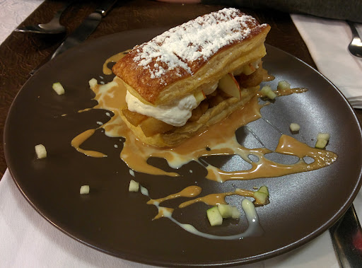 The chicken burger wasn't the best dish - was a sort of Normandy style burger, sliced cooked chicken in an apple & cider sauce, with sliced apples and a bun. Apart from frites there was no greenery. Hubby wouldn't order it again.