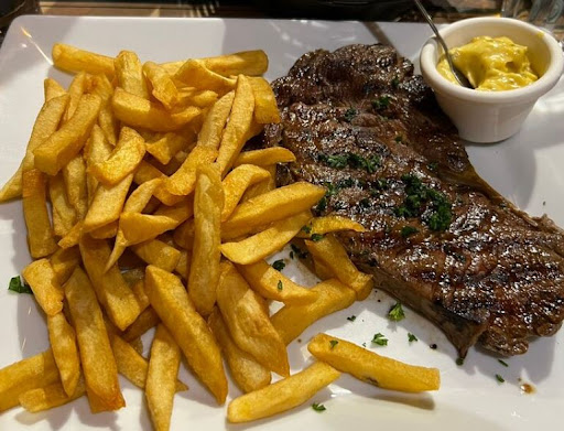 The menu leans into traditional favourites — think escargots, entrecôte, and camembert — all cooked with care and served generously. I had the Super Entrecôte, sauce au choix, avec frites with an aperol spritz, followed by a rich rice pudding. My fiancée enjoyed the Jambonnette de dinde, sauce au cidre, avec gratin with a Fiero Spritz, followed by a Charlotte aux fruits de la passion. Everything was spot on. Prices are reasonable (around €24 to €34 depending on the set menu choices), and the wine list offers good value.