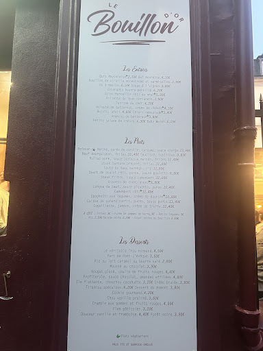 Ironie du sort : un serveur se permet de commenter à la table voisine, comparant ce " bouillon d'or" aux bouillons "Chartier" et " République " à Paris ! Étant franciliens et ayant déjà testé ces deux établissements, nous conseillons vivement au vôtre de faire preuve d'un peu plus d'humilité sous peine de boire le...