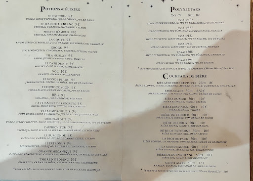 Un bar sur deux étages pour accéder à l'étage supérieur accrochez-vous l'escalier est un peu raide les personnes à mobilité réduite n'ont pas leur place même au rez-de-chaussée il est difficile pour des personnes valides de se déplacer entre les tables. Au niveau de l'accueil nous avons passé avec quasiment 5 minutes dans le bar à essayer de trouver une place sans avoir entendu un Bonjour en réponse au nôtre où voir quelqu'un se préoccuper de nous. Le patron bien trop occupé avec des amis dans le fond de la salle principale a mis un certain temps avant de se déplacer pour aider la pauvre serveuse qui courait dans tous les sens. Si vous allez dans ce bar pour être étonné par la décoration vous risquez de lettre surtout par le manque de déco en effet une armure de star Trooper en vitrine un balai Harry Potter accroché au plafond au sous-sol quelques petites affichette en ardoise avec des références de certains films ou séries rien de bien grandiose. En ce qui concerne la carte en dehors des tarifs excessif un grand nombre de boissons sont disponibles mais elles sont aussi disponibles à la concurrence seul le nom change. Nous étions quatre nous avons commandé deux cocktails une bière un chocolat viennois une gaufre et de cocktail été apparemment bon la bière légèrement tiède le chocolat viennois quand a lui était froid et la chantilly venait d'une bombe achetée dans le commerce la gaufre quant à elle était juste mangeable aucun goût malgré la tonne de sucre qui était dessus. Pour résumer la chose 35 minutes dans ce café pour en ressortir très déçu l'expérience ne sera...