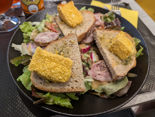Une expérience négative : dès l'entrée, le serveur nous prévient qu'il y a un peu d'attente. Quand légitimement mon compagnon lui demande combien de temps, il s'offusque du fait que nous sommes pressés et adopte un ton désagréable, qui durera tout le service (tout comme les petites piques sur les gens trop pressés). Evitez la salade César : poulet industriel, trop peu d'assaisonnement, tomates sans goût. Les croque-monsieurs, "italiens", annoncés "avec pesto", n'en avaient pas du tout le goût. La pièce de boeuf, commandée saignante, arrivée trop cuite, était difficile à couper et plus digne d'un pot au feu que d'une cuisson au beurre. Les frites, enfin : trop grasses, pas croustillantes pour deux sous, et vendues à prix d'or. Sur 4 convives, tous déçus, et atterrés par le rapport qualité prix. Nous sommes partis bien vite, sans...