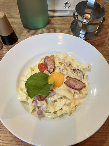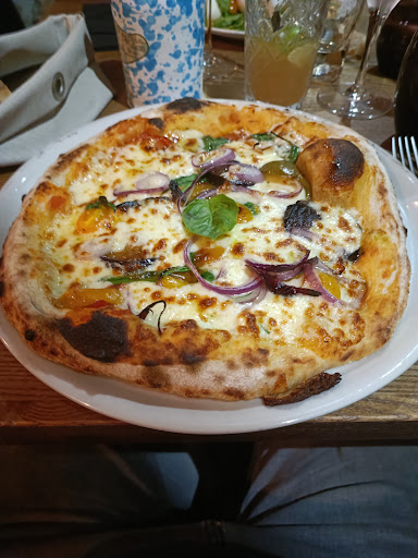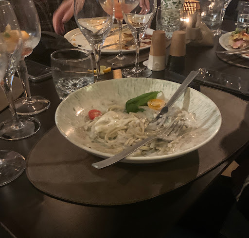 Read moreNous n'avons pas eut de cartes, restreints à taguer un QR code, sous prétexte que "nous sommes jeun's" alors que la table de 6 à côté y a eut le droit, j'ai trouvé ça très désagréable. Nous avons commandé une boisson en apéritif, et une pour le plat (qui m'a été difficile de commander puisque la serveuse est partie avant que je puisse lui donner mon choix). Voir la seconde arriver AVANT le plat, pendant l'apéritif, est assez dommage. Si la bannette de pain a été mise instinctivement, ce n'est pas le cas de la caraffe d'eau. S'il est agréable de voir les noms en italien pour les catégories, il est dommage de ne pas les retrouver pour chacun des plats. D'ailleurs, la présence d'une pizza "carbonnade", garnie de crème carbonara, est décevante, tant les deux plats n'ont rien à voir l'un avec l'autre : La carbonnade étant flammande, et la carbonara étant italianne. Ce devrait donc être une pizza carbonaRA. Par ailleurs le pluriel de pizza est pizze, et non ce francisme de "pizzas". Dans la logique de mettre les noms en italien, il est facile d'écrire "caffè" et "tè" qui restent compréhensibles ; c'est un détail mais un détail décevant quand on s'attarde sur la carte. Les détails ont leur importance et reflète le sérieux accordé à la carte. Ceci dit, malgré une carte discutable, la burratta à la truffe est tout juste bonne bien que le carpaccio à la truffe remplace le côté "burrata à la truffe" tant en entrée qu'en plat (elle est disponible dans les deux cas, c'est très positif). Malgré tout en plat, la burratta truffe n'a rien de plus qu'une pauvre burrata supplémentaire, et ce, pour 3e supplémentaires. La pizza végétarienne est également jolie, et correcte . Elle remplit bien l'estomac,ce qui constitue son deuxième avantage avec l'esthétisme, le goût étant équivalent à une mauvaise pizzeria de quartier. Au choix des desserts, quand elle est venue, elle nous a demandé, puis nous a snobé et s'est retourné immédiatement vers la table de 6. Quand cette dernière a donné ses choix, elle est repartie au comptoir sans prendre notre commande, puis est revenue comme une fleur 30s après. D'autant qu'un volte-face aurait suffi.