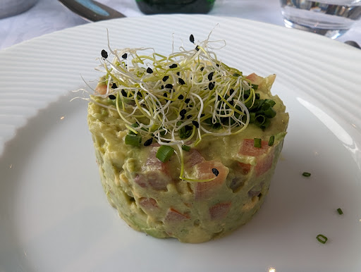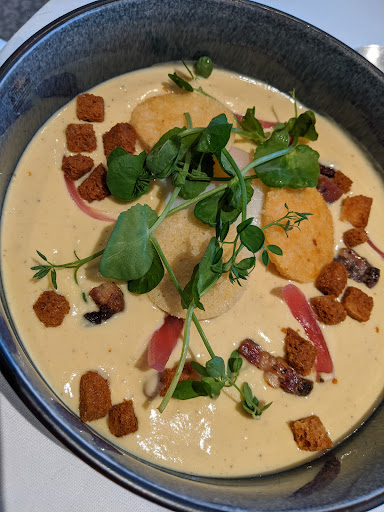 We started with a drink each and received a couple of amuse bouche, a couple of cheesey, crumbley shotbead style biscuits and a small mini quiche type of tartlet. Both lovely before the meaal itself.