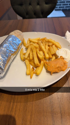 Pour avoir des frites il faut rajouter 1euros, alors que la quantité est vraiment minime, très très peu de frites (surgelées). Ce qui nous fait 6euros pour un kebab+frites sans la boisson.