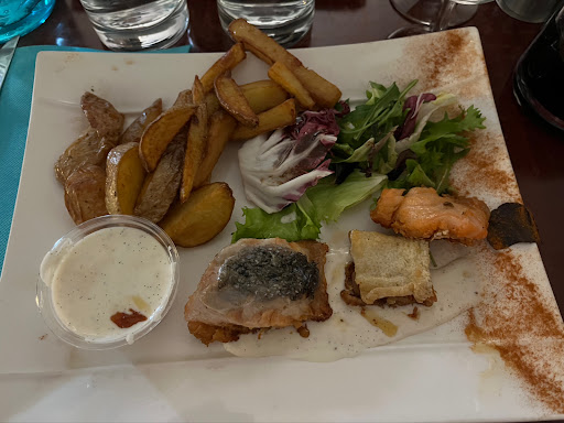 Nous avions commandĂ© un pavĂ© de saumon mi-cuit, et ce qui nous a Ă©tĂ© servi Ă©tait indigne dâune cuisine professionnelle. Comme en tĂ©moigne la photo (prise directement Ă son arrivĂ©e), le saumon Ă©tait coupĂ© en trois morceaux trop cuits, dont lâun nâĂ©tait rien dâautre que la peau. Le goĂ»t Ă©tait douteux, ce qui mâa poussĂ© Ă demander sâil Ă©tait frais. La serveuse mâa rĂ©pondu oui, mais son manque de connaissance sur la carte des vins â se limitant Ă âdu vin rouge comme dans les autres restosâ â me laisse douter de la fiabilitĂ© de cette rĂ©ponse.